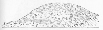 "The material consisted of earth, gravel, and stones, and also in some places broken trunks or branches of trees. Part of it was deposited in a pell-mell or unstratified condition during the progress of the period, and part either stratified or unstratified in the opening part of the next period when the ice melted."[2]