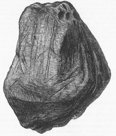 In this "till" or "hard-pan" are found some strange and characteristic stones. They are bowlders, not water-worn, not rounded, as by the action of waves, and yet not angular--for every point and projection has been ground off. They are not very large, and they differ in this and other respects from the bowlders found in the other portions of the Drift. These stones in the "till" are always striated--that is, cut by deep lines or grooves, usually running lengthwise, or parallel to their longest diameter. The cut on the following page represents one of them.