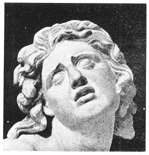 The Dying Alexander, so called. Type of a group of sculptures from the school of Pergamon, dating from the second century before Christ. The idealized portrait of Alexander as solar god has been discovered in the head of the celebrated Mithraic statue of the Capitol (see Fig. 4, page p. 21), and the facial expressions of dolor, pathos, and compassion which characterize this work are shared by all the more important representations of the Mithraic sacrifice. The present sculpture has been partly restored, and it is therefore impossible to determine absolutely whether it originally formed part of an Asiatic group of the tauroctonous Mithra. (T. et M., Introduction, p. 182.)