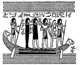 the forms of Horus, who is occupied in tying loops of rope to the elongated hawk-headed rowlocks in which the paddles may be worked. The boat of AF follows in the train of three boats, which may be thus described:--