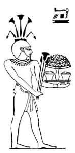 The offerings set out upon the altars for gods and ancestors were for the most part the articles of food which were eaten by the living; such as the head of a calf, the leg of a stag, a craw-fish, a loaf of bread, and various vegetables. At other times it was a cone of baked clay with a religious sentence stamped on the base, or a small stone pyramid with an inscription on each of the four sides (see Fig. 59). These were used as figurative of any gift, in consequence of the close resemblance of the words TEI, a gift, and TAU, a hill. On some occasions the priest presented fire and water to the statues of the gods as being the two purest of the elements. The water, or occasionally wine, was poured out of a tall slender jar, while a small quantity of burning charcoal was held forward in a metal ladle with a long handle to it (see Fig. 60), where we have figures of the king, the queen, and their son attending upon two priests, who are making the offerings. We