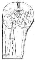 is Osiris, Isis, and Horus, a group, indeed, common to most parts of Egypt. Other groups were Isis, Nephthys, and Horus (see Fig. 22); or Isis, Nephthys, and Osiris; and with a national love for mysticism the priests often declared that the three in some undescribed way only made one person. The above figures, indeed, do not declare that the three gods are only one; but we have a hieroglyphical inscription in the British Museum as early as the reign of Sevechus of the eighth century before the Christian Era, showing that the doctrine of Trinity in Unity already formed part of their religion, and stating that in each of the two groups last mentioned the three gods only made one person (Egypt. Inscript. Pl. 36, 4, 5).