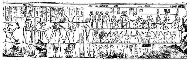 This opinion of the miraculous birth of the kings is well explained in a series of sculptures on the wall of the temple of Luxor (see Fig. 28). First, the god Thoth, with the head of an ibis, and with his ink and pen-case in his left hand, as the messenger of the gods, like the Mercury of the Greeks, tells the maiden queen Mautmes that she is to give birth to a son, who is to be king Amunothph III. Secondly, the god Kneph, the spirit, with a ram's head, and the goddess Athor, with the sun and cow's horns upon her head, both take hold of the queen by her hands, and put into her mouth the character for