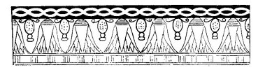 be found in our Museums among the Egyptian Antiquities, and they seem to have been copied from the painted borders which form the collars round the neck of the wooden mummy cases, and which are made of lotus flower and fruit alternately (see Fig. 44). The Breastplate of judgment worn by the Jewish high priest, called the Urim and Thummim, meaning emblems of royalty and truth, was also borrowed from Egypt, as we learn from these names, which are derived from the Egyptian words OURO, King, and THMEI, justice or truth. In Fig. 45 the