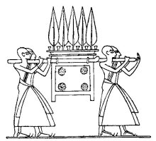 The greater number of the priests were certainly married, and on the funereal tablets we find a man boasting of his descent through a line of priestesses, perhaps as often as through a line of priests. In the case of the married priests, their wives were priestesses, and their children belonged to the same sacred order afterwards. The priestesses were more particularly musicians to the temple service. Their favourite instrument was a sistrum, a bronze ring, with a handle, and pierced with six holes, through which were passed three bronze wires which made a jingling noise when it was shaken. The dress of the priests and priestesses was for the most part that of the laity. The priestesses wore one thin robe, reaching from the neck to the ankles, sometimes loose, but sometimes so tight that they could only take short steps in walking. The priests also wore a thin garment reaching from the shoulders to the knees, and beneath it a short apron round the loins. These were all made of linen, as indeed were the garments of every man in the country. Flax was a native of Egypt, and hence curiously arose the opinion of the neighbouring nations that linen was the clothing most suited for the priesthood. Some few, however, of the priests are represented as wearing for their clothing the spotted skin of a leopard, with the claws and tail not removed from it (see Fig. 58). The monuments show us some priests with the head wholly shaven, and we see in Gen. xli. 14, that Joseph thought it necessary to shave himself when he went before Pharaoh in the