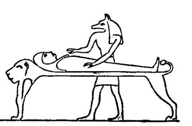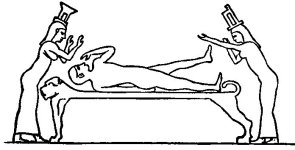 The goddess Isis and Nephthys were more particularly supposed to grieve at every man's death (see Fig. 67), and the god Anubis to assist in laying out the mummy. It was always placed on a lion-shaped couch (see Fig. 68). When placed in the mummy-case, as the death may have taken place on the east side of the Nile, while the burial places were usually on the west side, the ferrying it across the river was an important part of