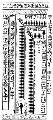 the entrance to the corridor, is a serpent, who ejects flames from his mouth; the flame from the one sweeps along the corridor, at the end of which it is met by the flame from the other serpent which sweeps along the inside of the inner wall. The flames of these serpents are said to be for Ra. The gateway leading to the Third Division is called SEPTET-UAUAU, and the door thereof, which opens inwards, is guarded by the serpent standing on his tail, who is called AQEBI, and faces outwards. The texts referring to the entrance of Ra through this gateway read:--