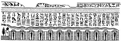 Along the middle of the THIRD DIVISION, we see the boat of the sun being drawn along by four gods, as before; the god Ra stands in a shrine, similar to that already described, and his companions are SA and HEKAU. The rope by which the boat is towed along is fastened to the two ends of a very remarkable object, in the form of a long beam, each end of which terminates in a bull's head. The accompanying text describes it as "his boat," and from the fact that the four gods who tow the boat are seen again at the other end of the beam-like object, with the towing-rope in their hands, it is clear that the boat of Ra, and the god himself, were believed to pass through it, from one end to the other. The object is supported on the