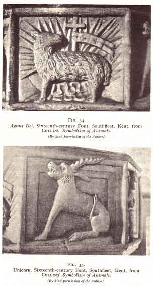 This being the current belief concerning the symbolism of the unicorn in the Middle Ages, it is not surprising to find this animal utilised in church architecture; for an example see fig. 35.