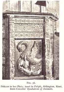 In some cases, though the symbolism is based upon quite erroneous notions concerning natural history, and is so far fantastic, it is not devoid of charm. The use of the pelican to symbolise the Saviour is a case in point. Legend tells us that when other food is unobtainable, the pelican thrusts its bill into its breast (whence the red colour of the bill) and feeds its young with its life-blood. Were this only a fact, the symbol would be most appropriate. There is another and far less charming form of the legend, though more in accord with current perversions of Christian doctrine, according to which the pelican uses its blood to revive its young, after having slain them through anger aroused by the great provocation which they are supposed to give it. For an example of the use of the pelican in church architecture see fig. 36.