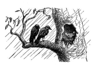 in this extremity the Crow and her mate went to the Sparrow, and said, 'Sparrow, Sparrow, have pity on us, and give us shelter, for the wind blows, and the rain beats, and the prickly pear hedge thorns stick into our eyes.' But the Sparrow answered, 'I am cooking the dinner, I cannot let you in now, come again presently.' In a little while the Crows returned, and said, 'Sparrow, Sparrow, have pity on us, and give us shelter, for the wind blows, and the rain beats, and the prickly pear hedge thorns stick into our eyes.' The Sparrow answered, 'I 'm eating my dinner, I cannot let you in now, come again presently.' The Crows flew away, but in a little while returned, and cried once more, 'Sparrow, Sparrow, have pity on us, and give us shelter, for the wind blows, and the rain beats, and the prickly pear hedge thorns stick into our eyes.' The Sparrow replied, 'I'm washing the dishes, I cannot let you in now, come again presently.' The Crows waited a while and then called out, 'Sparrow, Sparrow, have pity on us, and give us shelter, for the wind blows, and the rain beats, and the prickly pear hedge thorns stick into our eyes.' But the Sparrow would not let them in, she only answered, 'I 'm sweeping the floor, I cannot let you in now, come again presently.' Next time the Crows came and cried, 'Sparrow, Sparrow, have pity on us, and give us shelter, for the wind blows, and the rain beats, and the prickly pear hedge thorns stick into our eyes '--she answered, 'I 'm making the beds, I cannot let you in now, come again presently.' So, on one pretence or another, she refused to help the poor birds. At last, when she and her children had had their dinner, and she had prepared and put away the dinner for next day, and had put all the children to bed and gone to bed herself she cried to the Crows, 'You may come in now, and take shelter for the night' The Crows came in, but they were very vexed at having been kept out so long in the wind and the rain, and when the Sparrow and all her family were asleep, the one said to the other, 'This selfish Sparrow had no pity on us, she gave us no dinner, and would not let us in, till she and all her children were comfortably in bed; let us punish her.' So the two Crows took all the nice dinner the Sparrow had prepared for herself and her children to eat next day, and flew away with it.