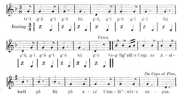 He went to the country of the Tsimshian, and married a girl of that tribe. The girl's brothers were sealion hunters. Once upon a time, during winter, gales were raging, and the brothers were unable to kill any sealions. One day Asi-hwî'l accompanied them. When they came to the sealions' rock, they found that there was a high swell, and they were unable to land. But Asi-hwî'l put on his snowshoes, took his staff, and jumped ashore. Then he ran up the rock and killed all the sealions. The brothers became jealous of him, and deserted him. When Asi-hwî'l had killed all the sealions and made ready to jump back into the canoe, he saw that the brothers had left. The tide began to rise. When it had almost covered the rock, he put his staff into a fissure and sat down on top of it. When the flood tide rose still higher, he tied his bow to the end of his staff and climbed on top of the bow. There he sat, and whistled the call which his father had taught him: