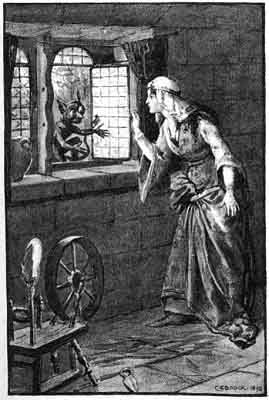Well, the woman she were wholly bate, and she took her spinnin' to the door to spin, and as she span she sang: