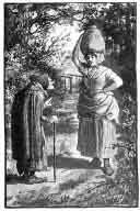 Now the woman knew very well that it was flour she had in her bag, but this made her feel so uncomfortable, that as soon as the witch was out of sight, she put down the bag off her head and opened it and looked in. And there, sure enough, it was not flour at all, nothing but manure! Well she thought, as she had carried it so far, she might as well carry it all the way, so she took it up again, and went home and set it down by the pig-sty. In the evening her husband came home.