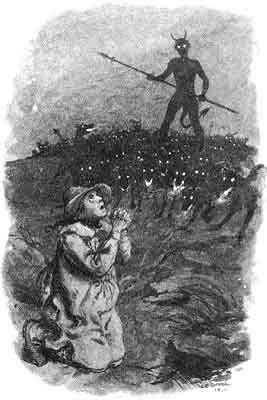 A herdsman was journeying homeward across the moors of Cornwall one windy night when be heard at a distance the baying of bounds, which he was not long in recognising to be the dismal yelp of the Devil's Dandy-dogs. He was three or four miles distant from his home; and, much terrified, he hurried onward as fast as the treacherous nature of the soil and uncertainty of the path would allow; but the melancholy yelping of the hounds and the fiendish shout of the hunter came nearer and nearer. After a long run they appeared so close upon him that he could not help turning round to look at them. He was horror-struck, for he could distinctly see the hunter and his dogs. The huntsman was terrible to behold. He was black, had large fiery eyes, horns, a tail, and carried in his clawy-hand a long hunting-pole. The dogs, a numerous pack, blackened the ground as far as it could be seen, each snorting fire and yelping in the most frightful tone. What was the poor rustic to do? No cottage was near, no rock, no tree to shelter him--nothing remained but to abandon himself to the fury of these hell-hounds. Suddenly a happy thought flashed into his mind. He had been told that no evil spirit can resist the power of prayer. He fell on his knees, and at the first holy words he uttered the hounds stood still, but yelped more dismally than ever; and the huntsman shouted, "Bo Shrove I!" which "means," says the narrator, "in the old language, The boy prays!" The black huntsman then drew off his dandy-dogs, and the poor herdsman hastened home as fast as his trembling frame permitted. 5