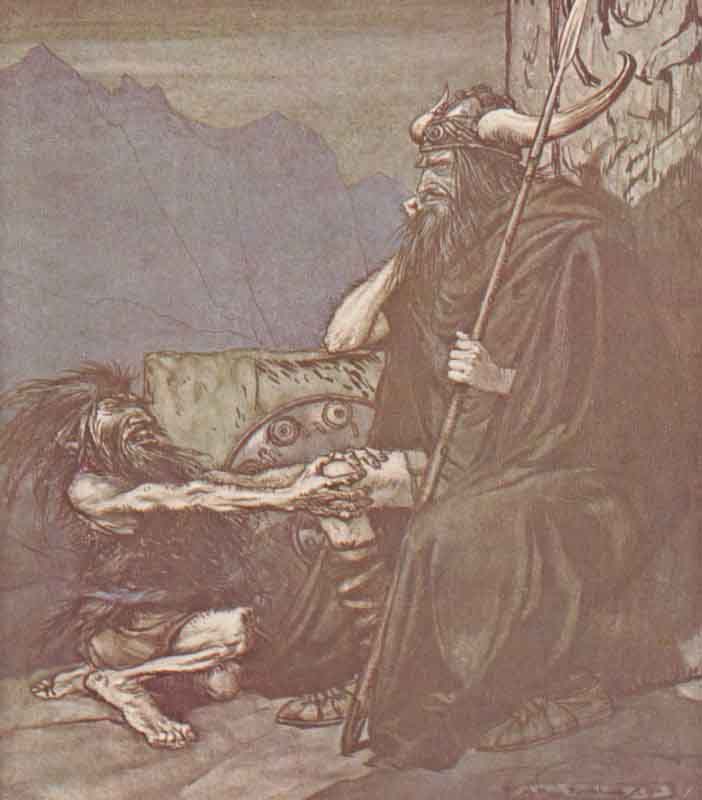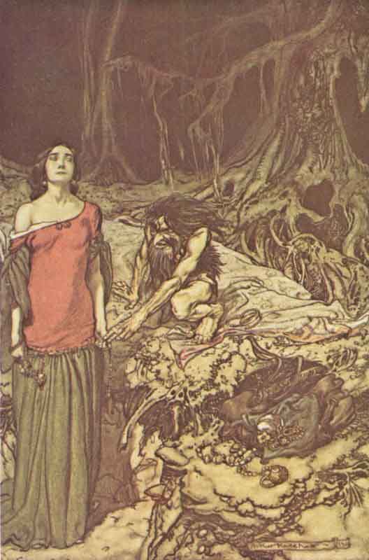 A open space on the shore in front of the Gibichungs' hall; to the right the open entrance to the hall, to the left the bank of the Rhine. From the latter, crossing the stage and mounting towards the back, rises a rocky height, cut by several mountain-paths. There an altar-stone to Fricka is visible, as well as one, higher up, to Wotan, and one at the side to Donner. It is night. Hagen, his arm round his spear and his shield by his side, sits against one of the pillars of the hall asleep. The moon shines out suddenly and throws a vivid light on Hagen and his immediate surroundings. Alberich is seen crouching in front of him, leaning his arms on Hagen's knees.