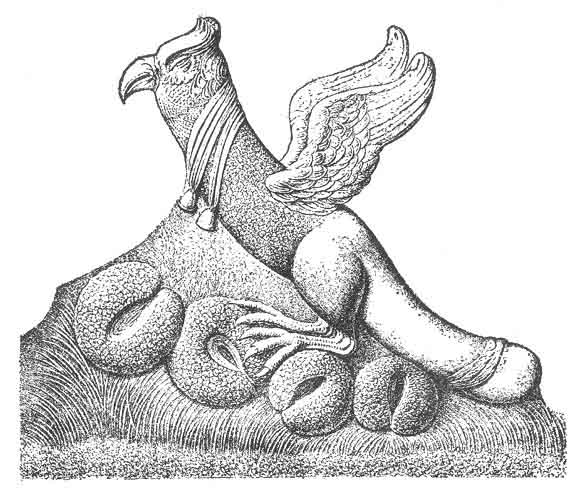 The first of these, 3 is the figure of a double phallus. It is sculptured on the lintel of one of the vomitories, or issues, of the second range of seats of the Roman amphitheatre, near the entrance-gate which looks to the south. The double and the triple phallus are very common among the small Roman bronzes, which appear to have served as amulets and for other similar purposes. In the latter, one phallus usually serves as the body, and is furnished with legs, generally those of the goat; a second occupies the usual place of this organ; and a third appears in that of a tail. On a pilaster of the amphitheatre of Nîmes we see a triple phallus of this description, 4 with goat's legs and feet. A small bell is suspended to the smaller phallus in front; and the larger organ which forms the body is furnished with wings. The picture is completed by the introduction of three birds, two of which are pecking the unveiled head of the principal phallus, while the third is holding down the tail with its foot.