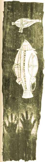 Bark Drawing: Pigmy Goose, Barramunda Fish, Stecilled Hands, (Kakadu Tribe)