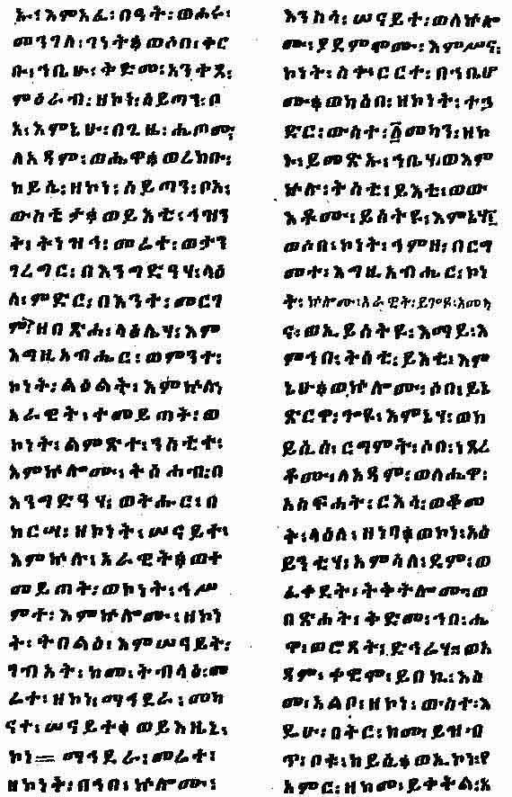 A page of the Ethiopic text of the "Book of Adam and Eve" (British Museum MS. Orient. No. 751, Fol. 110b) containing a description of the horrible appearance of the snake into which Satan entered when he went into the presence of Eve.