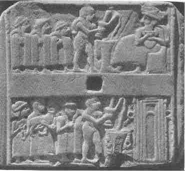 1. Limestone plaque with reliefs representing the King and his sons pouring out a libation to Nannar, the Moon-god. (See page 278.)
