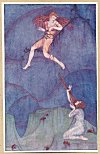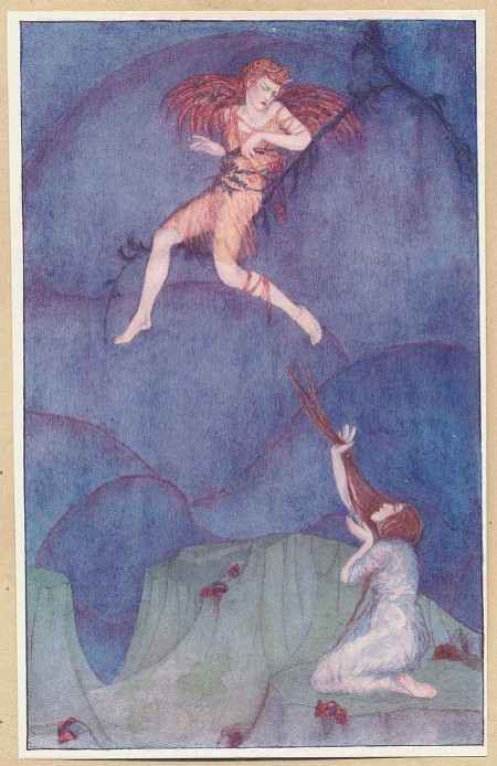 The God being burned in this sort, and perceiving that promise and faith was broken, he fled away without utterance of any word, from the eyes and hands of his most unhappy wife. But Psyche fortuned to catch him, as he was rising, by the right thigh, and held him fast as he flew about in the air, until such time that constrained by weariness she let go and fell down upon the ground. But Cupid followed her down, and lighted upon the top of a cypress tree, and angerly spake unto her in this manner: "O simple Psyche, consider with thyself, how I, little regarding the commandment of my mother, who willed me that thou shouldst be married to a man of base and miserable condition, did come myself from heaven to love thee, and wounded my own body with my proper weapons to have thee to my spouse. And did I seem a beast unto thee, that thou shouldst go about to cut off my head with a razor, who loved thee so well? Did not I always give thee in charge? did not I gently will thee to beware? But those cursed aiders and counsellors of thine, shall be worthily rewarded for their pains. As for thee, thou shalt be sufficiently punished by my absence." When he had spoken these words, he took his flight into the air.