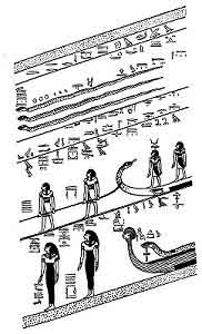[paragraph continues] As the further course of the corridor will be described under the Fifth Hour we may pass on to consider the Boat of the Sun, and the means by which the god makes his way onward.