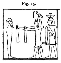 the deceased (Fig. 12) with the instrument ###[1], and the Kher-heb at the same time says: "O Sem priest, lay the pesh-en-kef upon his mouth, and say, 'I have stablished for thee thy two jaw-bones in thy face which was divided into two parts.'" The Sem priest next makes an offering of grapes (Fig. 13), the Kher-heb saying: "O Sem priest, place the grapes upon his mouth and say, 'He bringeth to thee the eye of Horus, he graspeth it; do thou also grasp it.'" After an ostrich feather has been offered (Fig. 14) by the Sem priest, and a number of the ceremonies described above have been repeated, and other animals slaughtered, the Kher-heb addresses the Sem priest, and says: "Take the instrument Tun-tet[2] (thrice) and open the mouth and the eyes" (four times). He then continues: "O Sem priest, take the iron instrument of Anubis, Tun-tet (thrice). Open the mouth and the two eyes (four times), and say, 'I open for thee thy mouth with the iron instrument of Anubis with which he opened the mouths of the gods. Horus openeth the mouth, Horus openeth the mouth,