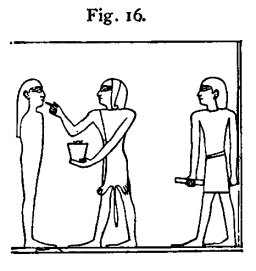 band or fillet (Fig. 15), and to say: "Lo! the nemes fillet, the nemes fillet, which cometh as the light, which cometh as the light; it cometh as the eye of Horus, the brilliant; it cometh forth from Nekheb. The gods were bound therewith; bound round is thy face with it in its name of Hetch (i.e., light, or brilliance), coming forth from Nekheb. "All that could do harm to thee upon earth is destroyed." The Sem priest, holding a vase of ointment in his left hand, and smearing the mouth with his fore-finger (Fig. 16), says: "I have anointed thy face with ointment, I have anointed thine eyes. I have painted thine eye with uatch and with mestchem. May no ill-luck happen through the dethronement of his two eyes in his body, even as no evil fortune came to Horus through the overthrow of his eye in his body. Thy two eyes are decked therewith in its name of Uatch, which maketh thee to give forth fragrance, in its name of "Sweet-smelling." A number of scented unguents and perfumes are brought forward, and at the presentation of each a short sentence is recited by the Kher-heb having reference to the final triumph of the deceased in the underworld and to the help which the great gods will render to him.