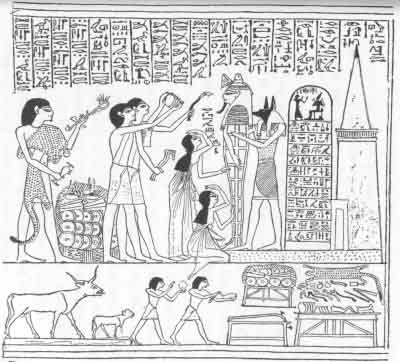 The ceremony of "opening the mouth" being performed on the mummy of Hunefer, about B.C. 1350