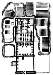 The Egyptians were of a gloomy, serious disposition, and they worshipped in fear rather than in gratitude. Their prayers and sacrifices were sin-offerings rather than thank-offerings. The architecture of their temples was in harmony with their religion. The inner sanctuary, the holy of holies, was always a dark room. Fig. 31 is the ground plan of the temple of Errebek in Thebes, built by Oimenepthah I., and finished by his son Rameses II. The worshippers were allowed to enter a first courtyard, and a second courtyard through gateways formed of massive towers. An avenue between two rows of sphinxes brought them to the portico, under which the sacrifices and libations were made in their sight and on their behalf. But none