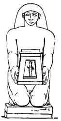 not invented till long after the fall of Thebes (see Fig. 53). And on the sarcophagus of Amyrteus we have a procession of priests each carrying a palm branch (see Egypt. Inscript. Pl. 28 and 30), accompanying the priests with feathers on their heads. We have also many statues of the scribes, seated on the ground cross-legged with the roll of papyrus on the knees. Statues also of the Pastophori, or shrine-bearers, are not uncommon. They are sometimes sitting on the ground, and some times kneeling (see Fig. 54). The shrine or model of a temple usually has in front of it a small figure of the god to whom it is dedicated.
