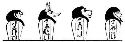 days in embalming the patriarch Jacob, and mourned for him the usual time of seventy days (see Genesis l. 3)The softer and more moist parts of the body were some of them placed in four earthen jars, called Canobic jars, either from the city of Canopus, or from the name of the god Kneph or Cenubis. These jars have lids in the shape of the heads of a man, an ape, a jackal, and a hawk (see Fig. 66). They represent the four lesser gods of the dead, and their names seem to describe the different operations in mummy-making over which they watched. Amset, the carpenter, has a man's head; Hepi, the digger, has an ape's head; Smotef, the shaper, has a jackal's head; and Snouf, the bleeder, has a hawk's head. But the heads of the two last are sometimes changed one for another, and sometimes, in the place of Smotef, we have Sottef, the cutter or purifier.