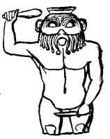 [paragraph continues] The western half of the Delta had received a considerable colony of Greek traders, and hence arose a mixed population, half Egyptian and half Greek; and in the eastern half of the Delta there was a yet larger number of Jewish and Phenician (sic) settlers, from the latter of whom sprung a population half Egyptian and half Phenician. Naucratis in the west was wholly a Greek city, and Sais, the western capital, was very much under Greek influence. On the other side, Isaiah tells us that there were as many as five cities on the Pelusiac, or eastern branch of the Nile, where Hebrew was the language spoken in the streets. Pelusium was wholly peopled by Phenician sailors, and so numerous were they in Memphis, that one part of the city was called the Tyrian quarter. Though the Greeks introduced many new arts into Egypt, they probably brought about no change in the religion; in religious matters they were always happy to learn from the Egyptians. Far otherwise was the case with the Phenicians; and many of the gods worshipped at Memphis were considered by Heroditus (sic) to be Phenician deities. Hence it is probable that the religion of Lower Egypt was largely covered with Phenician opinions. At any rate, from whichever of the above causes it arose, we now find more frequent and stronger proofs that the gods were worshipped in fear rather than in love; that the sacrifices were made less than they used to be in thankfulness for blessings received, and more often than formerly, as an atonement to turn aside punishment that is dreaded. Pthah, the great god of Memphis, is now an ugly dwarf, with an enlarged head (see Fig. 77), and he sometimes holds a club over his head, as if in the act of threatening his worshippers with vengeance (see Fig. 78). He is the father of a brood of children as ugly and malicious as himself. These are the Cabeiri, whose office
