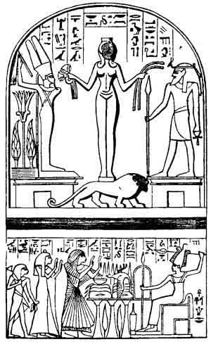 Another Phenician deity is the foreign Venus, chiefly worshipped at Memphis, who, unlike the Egyptian goddesses, is wholly unclothed. She is Athor under a new form, having her long hair falling in two locks on her shoulders, and having a basket on her head (see Fig. 81). She shows us a front view, and stands upon a lion that walks side-ways. She stands between two gods, each on the top of a small temple with a door. One is the Egyptian Chem, who, with his right arm raised, holds the whip. The other is a foreign god, with an Asiatic beard: he holds a spear in his right hand, and the character for life in his left hand. In place of the sacred Asp, the usual ornament of a god's forehead, he has a dog's or stag's head with two long ears, like that on the top of an Anubis-staff. The name of the goddess is Koun, the queen of Heaven; the name of the foreign god is Ranpo, Lord of Heaven, and king of the other gods. To Chem, the goddess presents a bunch of flowers, emblems of life, and to the foreign god two serpents, emblems of death, thus declaring the Gnostic and Manichean doctrine of Antitheses or oppositions between life and death, or good and evil, a doctrine of which we see many more traces in