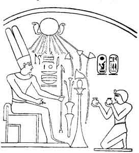 sending forth a number of rays, each ending with a human hand, and yet more particularly by the absence of the human figure or statue of the god. In this the sculptor borrows a figure from the name of the Persian king, who was called Longimanus, because his arm was supposed to over Asia, reach Africa, and part of Europe. And when we see a sculpture with one of the early Theban kings worshipping the figure of Amun-Ra, with the same sun, as in Fig. 84, we may suppose that the rays ending in human hands were an after addition made by order of the Persians.