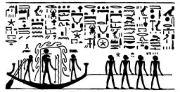 In the middle of this Division we see the boat of the sun being towed on its way by four gods of the Tuat; the god is in the same form as before, and his