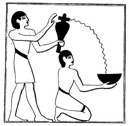 The ceremonies symbolizing the nursing of Horus by Osiris having been performed, the SEM priest took libation vases of pure water of the north, i.e., from the Delta, not water with natron dissolved in it, and went