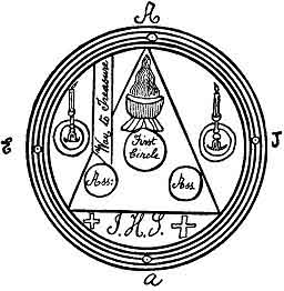 the stone called Ematille you must trace the triangle within the circle, beginning at the eastern point. A large A, a small E, a small A, and a small J, must be drawn in like manner, as also the sacred name of Jesus between two crosses. By this means the spirits will have no power to harm you from behind The Karcist and his assistants may then fearlessly proceed to
