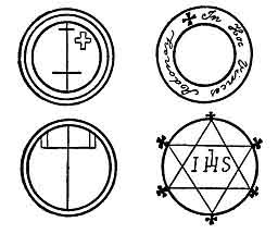After sunrise, a black cock must be killed, the first feather of its left wing being plucked and preserved for use at the required time. The eyes must be torn out, and so also the tongue and heart; these must be dried in the sun and afterwards reduced to powder. The remains must be interred at sunset in a secret place, a cross of a palm in height being set upon the mound, while at each of the four corners the signs which here follow must be drawn with the thumb:--
