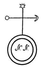 Whether in the increase or wane of the Moon, a star must be observed between eleven o'clock and midnight. But before beginning do as follows. Take a virgin parchment. Write thereon her name whose presence you desire. The parchment must be shaped as represented in the following figure. On the other side inscribe these words: Melchiael, Bareschas. Then place your parchment on the earth, with the person's name against the ground. Set your right foot above it, while your left knee is bent to the earth. In this position observe the brightest star in the firmament, holding in the right hand a taper of white wax, large enough to last for an hour, and recite the following