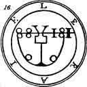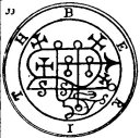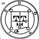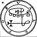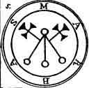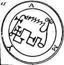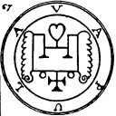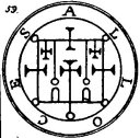 a Viper in his hand. His Office is to discover Things Hidden, Witches, Wizards, and Things Present, Past, and to Come. He, at the command of the Exorcist will build Towers, overthrow Great Stone Walls, and make the Waters rough with Storms. He governeth 36 Legions of Spirits. And his Seal is this, which wear thou, as aforesaid, etc.