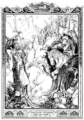 Then Punchkin got frightened, and said, "Anything, anything; name what price you will, and it shall be yours." The Prince answered, "Let the seven Raja's sons whom you turned into rocks and trees be instantly liberated."