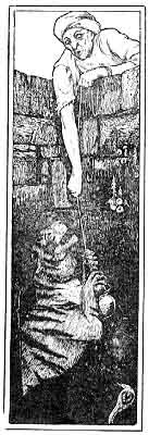 At last he succeeded; heaven threw in his way a ruined well. He thought he could collect some water if he let down his chombu with the string that he always carried noosed to the neck of it. Accordingly he let it down; it went some way and stopped, and the following words came from the well: "Oh, relieve me! I am the king of tigers, dying here of hunger. For the last three days I have had nothing. Fortune has sent you here. If you assist me now you will find a sure help in me throughout your life. Do not think that I am a beast of prey. When you have become my deliverer I will never touch you. Pray, kindly lift me up." Gangazara thought: "Shall I take him out or not? If I take him out he may make me the first morsel of his hungry mouth. No; that be will not do. For my father's prophecy never came untrue. I must die on a sea-coast, and not by a tiger." Thus thinking, he asked the tiger-king to hold tight to the vessel, which he accordingly did, and he lifted him up slowly. The tiger reached the top of the well and felt himself' on safe ground. True to his word, he did no harm to Gangazara. On the other hand, he walked round his patron three times, and standing before him, humbly spoke the following words: