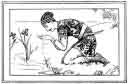 He saw a pretty, clear little brook running along not far from their resting-place, and hearing that its source was not far distant, he started off to find it. The source was a beautiful lake, which at that time was covered with the magnificent lotus flower and other water plants. The prince sat down on the bank, and being thirsty took up, some of the water in his hand. Fortunately he looked into his hand before drinking, and there, to his great astonishment, he saw reflected whole and clear the image of a beautiful fairy. He looked round, hoping to see the reality; but seeing no person, he drank the water, and put out his hand to take some more. Again he saw the reflection in the water which was in his palm. He looked around as before, and this time discovered a fairy sitting by the bank on the opposite side of the lake. On seeing her he fell so madly in love with her that he dropped down in a swoon.