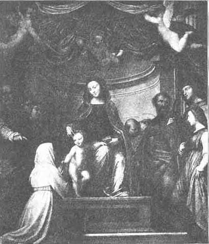 | THE MARRIAGE OF ST. CATHARINE. By Fra Bartolommeo, 1475-1517. (Louvre.) Because of the nun's habit this can only be Catharine of Siena. |
