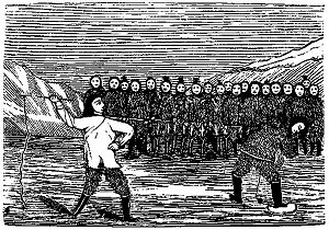 him. Soon after, Kunuk courageously put his foot on the hare; but the very moment the "strong man" lifted up his whip Kunuk stooped down and hardened his limbs (by charm), and when the other smote him the whip gave a loud crack. The "strong man" now believed that he had killed Kunuk, who nevertheless came away unhurt. When the crack of the thong was heard, the "strong man" ordered the younger brother to step forward. He, however, cared less than Kunuk: and after the first attempt the chief proposed that he should take the whip for a change; and giving it to him, he went himself and put his foot on the hare. Kunuk's brother now cried, "Look out and harden thy body!" but at the same time smote him, so that he p. 139 fell down dead on the spot. All his inferiors now rejoiced greatly, and called out to the brothers, "Henceforth ye shall be our leaders!" but they rejoined, "In future ye shall have no masters, but hunt at liberty and at your own will." The brothers now practised all manner of feats belonging to kayaking and seal-hunting, and procured themselves bladder-arrows1—the bladders being made out of one entire blown-up seal-skin. One day they joined some other kayakers, and went in pursuit of a very large she-walrus. Kunuk lanced it four times at a greater distance than usual, and his arrow went right through the animal, which, panting for breath, after a minute or two was quite dead. When the others came on to give it the finishing stroke, they found that the arrow had penetrated to the very vent-holes of the bladder; and they all rejoiced at his great dexterity, and praised it highly. Ordinary seals even grew quite stiff when his spear merely grazed them. He once heard a report of a very giant, who lived southward, and was named Ungilagtake.2 He had a huge sword, and nobody was ever known to escape him; even the most valiant of men were vanquished and put to death by him. On hearing this, the brothers immediately supposed him to have been among the strong armed men who attacked their housemates at home, when they themselves were still little children; and they at once determined to go and find him out, knowing that they were now more capable of revenging themselves than they had been at that time. They left the place in two boats, one of which belonged to the youngest; in this the mother of the "strong man" who had been killed accompanied him. The other boat was Kunuk's, and many kayaks went along with them to make war against Ungilagtake. A pretty strong breeze from p. 140 the north had sprung up, and the boats hoisted their sails, and the kayak-men amused themselves with throwing their harpoons alongside the boats. It so happened that Kunuk, in flinging the harpoon, hit the prow of the boat, so that it rebounded into the water with a great splash. On seeing this, the old hag chuckled, and went on mocking and teasing the wife of Kunuk till she could not help crying; and Kunuk asked his brother, who was in command of the boat, "Why is my wife crying?" "Oh, that's on account of the arrow," he answered; "she is so mortified because the old woman laughed at thee." Kunuk now purposely dropped astern a little, and holding his harpoon ready, suddenly pushed forward, and flung it across the boat, so that it hit the hood of the old woman's fur coat, while she sat rowing in the fore-end of the boat, even tearing a piece out of it; and this trick he repeated once more. After a while, Kunuk's brother turned his looks towards land, and recognised the burial-place of their little sister. This made him very sad, and he asked for some one to relieve him at the helm, he wanting to go and sit down forward, where, bent down, he went on sobbing, and vainly striving to keep back his tears, while the water from the sea came into the boat, which kept swinging and tossing from his convulsions. He took ill from that very day, and died before they reached their destination, so that Kunuk came alone to Ungilagtake. It was in the depth of winter, and they were met by many people on the ice. A somewhat biggish man invited them to come and put up at his house. This man likewise happened to be an enemy of Ungilagtake; and as soon as the guests had entered, he told them that before the meal he would show them how Ungilagtake used to behave to strangers. He took an entire seal-skin, stuffed with sand, and to the centre of which a strap was attached. Into this he put his third finger, and carried it round the room, after which he ordered his guest to do the same. Kunuk p. 141 took hold of the strap with his little finger, lifted the thing with unbent arm, and put it down without being fatigued. The host then went on, "Now sit down opposite to me, and I will throw a lance at thee, which, however, won't hurt thee;" upon which he brought out a lance and a drum, and began singing, while Kunuk heard the others saying, "Bend thee down, stranger!" Kunuk at once complied, so that nothing but his chin was visible; and when his host threw the lance at him, he lost his aim, merely observing, "This is the way of Ungilagtake, who always hits the mark, and never fails. Yet I don't know how thou wilt fare with him; he will hardly be able to molest thee. But then he has a companion, called Tajangiarsuk, with a double back, being as fat in front as behind, who is immensely strong, and gives him a hand if there happen to be any one he cannot master." Whilst they were sitting down at the meal a cry was heard without, "Ungilagtake invites the stranger to his house!" When Kunuk and his wife were preparing to go, the host said, "Now make a bold entrance, or he will be sure to kill thee at once." The visitors now went up to a large house with three windows, which was occupied with Ungilagtake's numerous wives—all of whom he had stolen. Kunuk was ordered to sit down on the side bench, but his wife was brought to a seat on the main ledge, and their former host placed himself opposite her husband. Many other spectators now entered; but w