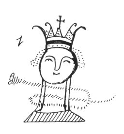 FIG. 30--The lord of the katun. (Chumayel MS.). Each prophecy of this series is headed by an illustration similar to this one. It consists of a crowned head, and the crown is surmounted by a cross. It evidently represents a so-called "ruler" mentioned in a number of the prophecies, but there is some uncertainty as to the function of his personage in connection with each new katun. In the Tizimin (p. 22) and Mani (Code. Perez, p. 120) manuscripts we read of a certain Katun 8 Ahau that "the ruler of the people of Uxmal was painted." It is possible that this means that a picture of this ruler headed the prophecy for the katun: but Katun 8 Ahau "was established" at Izamal and not Uxmal according to the present series of katun-prophecies . |