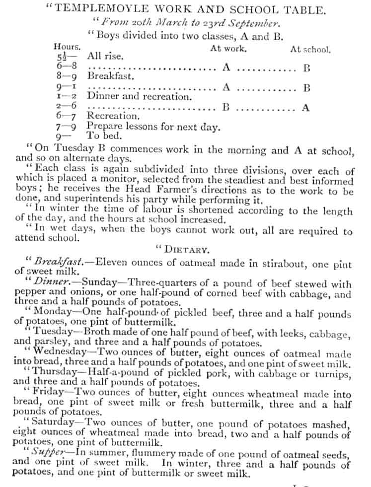 "Each class is again subdivided into three divisions, over each of which is placed a monitor, selected from the steadiest and best-informed boys; he receives the Head Farmer's directions as to the work to be done, and superintends his party while performing it.