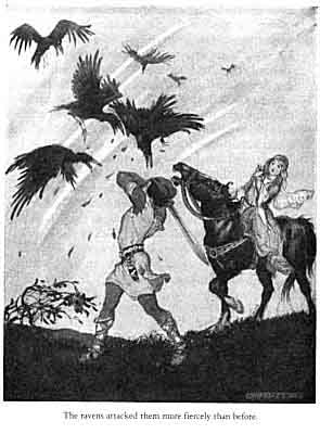He mounted the steed again, and they rode swiftly on. And the ravens came the third time and attacked them more fiercely than before. The King's Son fought them until he had killed all but three and until he was covered with their blood and feathers.