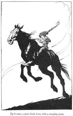They went into the wood, Flann and Morag, and the Little Red Hen was under Morag's arm. They thought they would hide behind trees until they heard the coming of the Pooka and his horse. But they were not far in the wood when they heard Crom Duv coming towards his house. He came towards them with the iron spike in his hand. Flann and Morag ran. Then from tree to tree Crom Duv chased them, shouting and snorting and smashing down branches with the iron spike in his hand. Morag and Flann came to a stream, and as they ran along its bank they heard the trampling and panting of a horse coming towards them. Up it came, a great black horse with a sweeping mane. "Halt, Pooka," said Flann in a commanding voice. The black horse halted and the Pooka that was its rider slipped down to its tail.